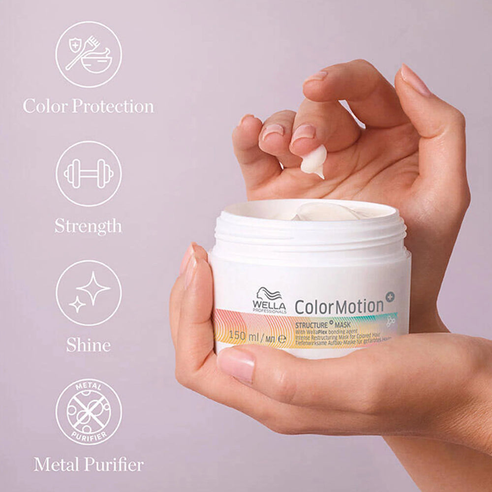 استمتعي بقوة ثلاث فوائد في علاج واحد مكثف مع قناع ويلا كولور موشن+ ستراكشر+ . صُمم هذا القناع المتطور لإعادة بناء الشعر خصيصًا للشعر المصبوغ الذي يحتاج إلى تقوية فائقة، حيث يعمل على تقوية بنية الشعر مع الحفاظ على لونه الزاهي.