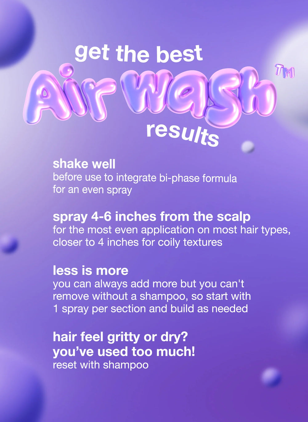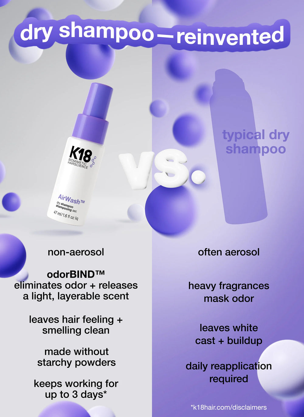 Reinvent your refresh routine with K18 AirWash™, a breakthrough dry shampoo that cleans hair without the powdery mess. Unlike traditional aerosols that just coat the hair in starch and fragrance, this non-aerosol, liquid-to-powder mist actually eliminates oil and odor for a clean that lasts up to 3 days.